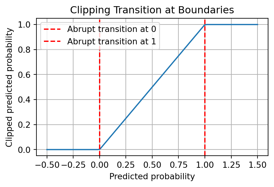 import numpy as npimport matplotlib.pyplot as pltdef clip_prob(p):return np.clip(p, 0, 1)# Simulated predicted probabilitiespredicted_probs = np.linspace(-0.5, 1.5, 100)# Clipped probabilitiesclipped_probs = clip_prob(predicted_probs)plt.figure(figsize=(5, 3))plt.plot(predicted_probs, clipped_probs)plt.xlabel('Predicted probability')plt.ylabel('Clipped predicted probability')plt.title('Clipping Transition at Boundaries')plt.grid(True)plt.axvline(x=0, color='red', linestyle='--', label="Abrupt transition at 0")plt.axvline(x=1, color='red', linestyle='--', label="Abrupt transition at 1")plt.legend()plt.show()