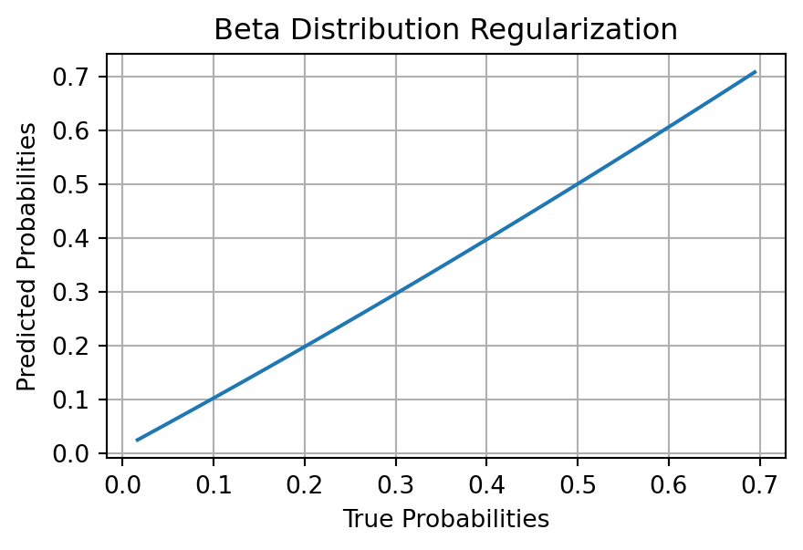 import numpy as npimport matplotlib.pyplot as pltfrom sklearn.linear_model import LinearRegression# Simulated probabilitiesnp.random.random(69)y_prob = np.random.beta(2, 5, 100)def estimate_alpha_beta(mean, var): common_term = mean * (1- mean) / var -1 alpha_est = mean * common_term beta_est = (1- mean) * common_termreturn alpha_est, beta_estdef regularize_prob(p, alpha, beta):return (alpha + p) / (alpha + beta +1)def logit(p):return np.log(p / (1- p))# Calculate alpha and betamean = np.mean(y_prob)var = np.var(y_prob)alpha_est, beta_est = estimate_alpha_beta(mean, var)# Regularize and convert to log-oddsy_regularized = regularize_prob(y_prob, alpha_est, beta_est)y_logit = logit(y_regularized)# Fit a linear modelmodel = LinearRegression()model.fit(y_prob.reshape(-1,1), y_logit)# Predicty_pred_logit = model.predict(y_prob.reshape(-1,1))y_pred_regularized = sigmoid(y_pred_logit)# Convert back to original scaley_pred_prob = (y_pred_regularized * (alpha_est + beta_est +1) - alpha_est)plt.figure(figsize=(5, 3))argsort = np.argsort(y_prob)plt.plot(y_prob[argsort], y_pred_prob[argsort])plt.xlabel('True Probabilities')plt.ylabel('Predicted Probabilities')plt.title('Beta Distribution Regularization')plt.grid(True)plt.show()