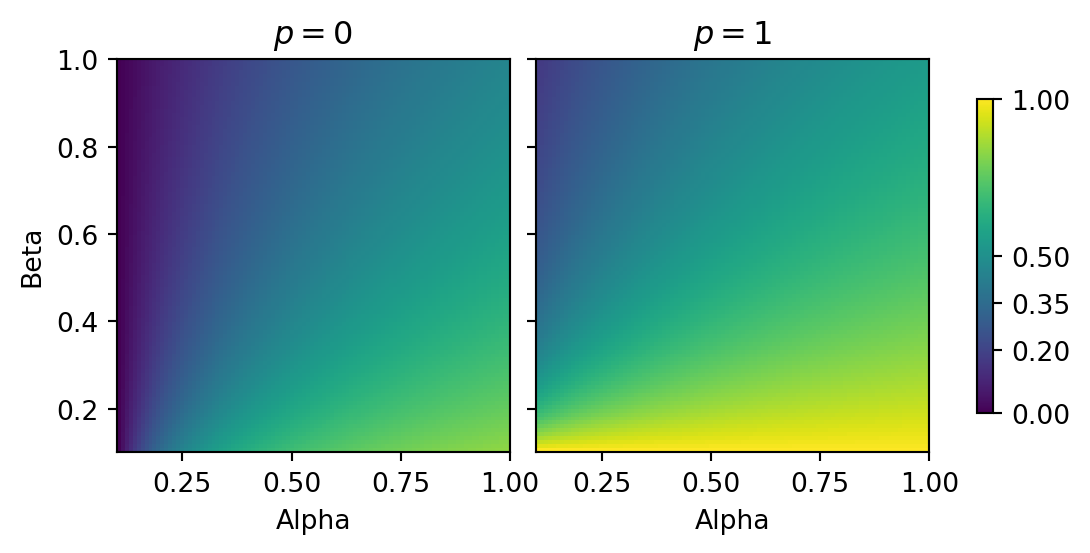 import numpy as npimport matplotlib.pyplot as pltdef regularize_prob(p, alpha, beta):return (alpha + p) / (alpha + beta +1)# Define the range of values for alpha, beta, and palpha_values = np.linspace(0, 5, 100)beta_values = np.linspace(0, 5, 100)# regularise extreme probabilitiesregularized_prob_0 = np.array([[regularize_prob(0, alpha, beta) for alpha in alpha_values] for beta in beta_values])regularized_prob_1 = np.array([[regularize_prob(1, alpha, beta) for alpha in alpha_values] for beta in beta_values])fig, axs = plt.subplots(1, 2, figsize=(7, 3), sharey=True)# Calculate the minimum and maximum values of the regularized probabilityvmin =min(np.min(regularized_prob_0), np.min(regularized_prob_1))vmax =max(np.max(regularized_prob_0), np.max(regularized_prob_1))# Create the subplots and colorbarc0 = axs[0].imshow(regularized_prob_0, cmap='viridis', origin='lower', extent=[0.1, 1, 0.1, 1], vmin=vmin, vmax=vmax)axs[0].set_title("$p = 0$")axs[0].set_xlabel('Alpha')axs[0].set_ylabel('Beta')c1 = axs[1].imshow(regularized_prob_1, cmap='viridis', origin='lower', extent=[0.1, 1, 0.1, 1], vmin=vmin, vmax=vmax)axs[1].set_title("$p = 1$")axs[1].set_xlabel('Alpha')fig.colorbar(c1, location ="right", shrink=0.8, ticks=[vmin, 0.2, 0.35, 0.5, vmax], format="%.2f")plt.subplots_adjust(wspace=-1)plt.tight_layout()plt.show()
